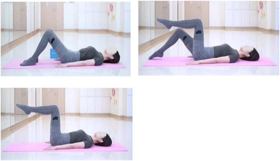 Ⅰ: Patients adopted a supine neutral posture with knees bent and hands placed at their sides, employing the transverse breathing technique. The exercise involved several steps: (1) during inhalation, the right hip and knee were flexed to a 90° angle, positioning the thigh perpendicular to the floor and the lower leg parallel to the floor, with toes pointed, and this position was maintained during exhalation. (2) Then, on the next inhalation, the left leg was elevated and held during the subsequent exhalation. (3) The following inhalation was used to prepare for the next movement; during this phase, the shoulders remained relaxed, the ribs were lowered, and the abdominal and pelvic floor muscles were activated. This was followed by returning the right leg to its initial position and holding it there during exhalation. (4) Upon inhaling again, the left leg was returned to the starting position and maintained during exhalation.