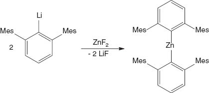 To a solution of 2,6-Mes2 C6 H3 Li (500 mg, 1.56 mmol) in diethyl ether (10 mL) at -78°C, a suspension of ZnF2 (81 mg, 0.78 mmol) in diethyl ether (10 mL) was added. After 2 h, the mixture was warmed up to room temperature and stirred for an additional 12 h. The mixture was filtered and the volatile materials were removed under reduced pressure. Recrystallisation of the residue from n-hexane/CH2 Cl2 afforded colourless crystals of (2,6-Mes2 C6 H3)2 Zn (0.488 g, 0.71 mmol, 90%; Mp. 122°C).