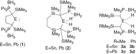 The reaction between iPr2 PCl and one equivalent of MeMgBr, followed by one equivalent of BH3·SMe2, gives the phosphine-borane iPr2 P(BH3)Me (4). Treatment of 4 with nBuLi, followed by Me3 SiCl, gives the sterically demanding phosphine-borane {iPr2 P(BH3)}(Me3 Si)CH2 (5) in good yield. Metalation of 5 with nBuLi yields {iPr2 P(BH3)}(Me3 Si)CHLi (6), which was crystallised as the TMEDA adduct [{iPr2 P(BH3)}(Me3 Si)CH]Li(TMEDA) (6a) and characterised by X-ray crystallography [TMEDA = N,N,N′,N′-tetramethylethylenediamine]. The reaction between two equivalents of in situ-generated 6 and Cp2 Sn in toluene gives the dialkylstannylene [{iPr2 P(BH3)}(Me3 Si)CH]2 Sn (7), which was crystallised from methylcyclohexane/THF as the rac diastereomer. X-ray crystallography reveals that stabilisation of the Sn centre in 7 is afforded by two agostic-type B-H…Sn interactions, one from each BH3 group.