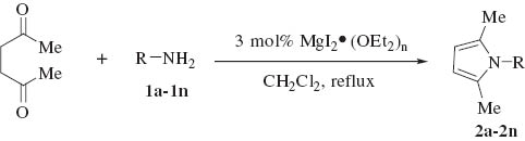 We describe a convenient and useful procedure for the synthesis of various 2,5-dimethyl-N-substituted pyrrole derivatives by the addition of 2,5-hexadione with aromatic amines, heteroaromatic amines and aliphatic amines catalyzed by MgI2 etherate (MgI2·(OEt2)n) in good to excellent yields.