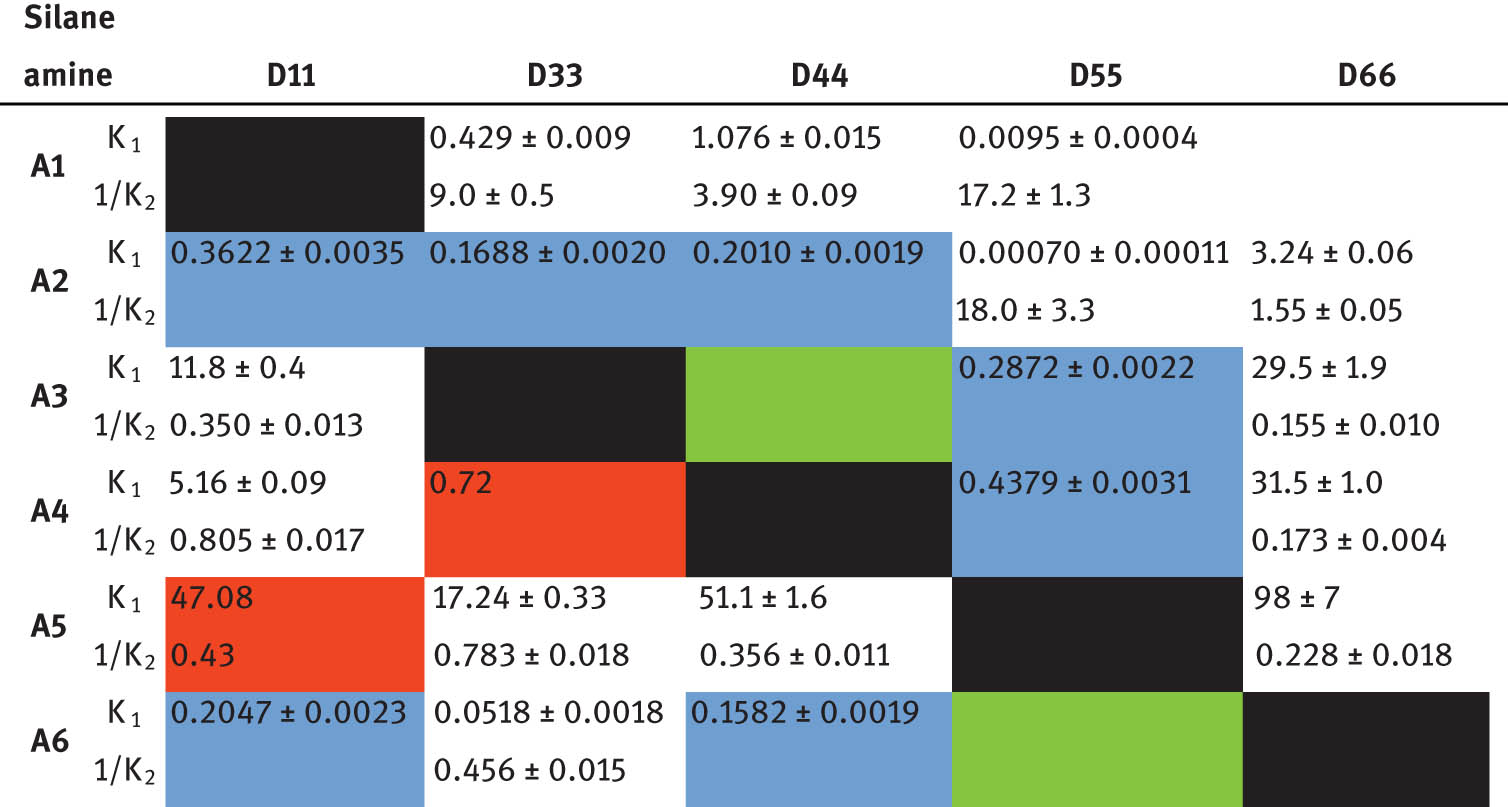 Equilibrium constants K D of the reaction of two diaminosilanes