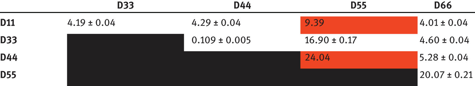 In Table 6, the calculated equilibrium constants of the second reaction (K 2) are shown as reciprocal to simplify the comparison to K 1. It can be seen that the values of K 1 of one reaction and 1/K 2 of the reaction of the opposite direction are similar to each other.