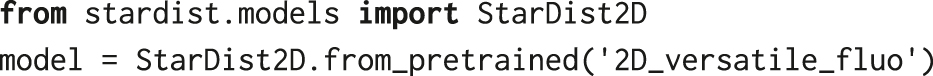 For identifying nuclei from the H2B channel, we use a Python implementation of star-convex object detection for 2D and 3D images, as described in [20]–[22]. The method is based on a convolutional neural network that, for every pixel, predicts a polygon for the cell instance at that position. The package provides a pretrained model, 2D_versatile_fluo, for 2D images of nuclear fluorescent markers. As a preparation step, we create an instance of a pretrained model: