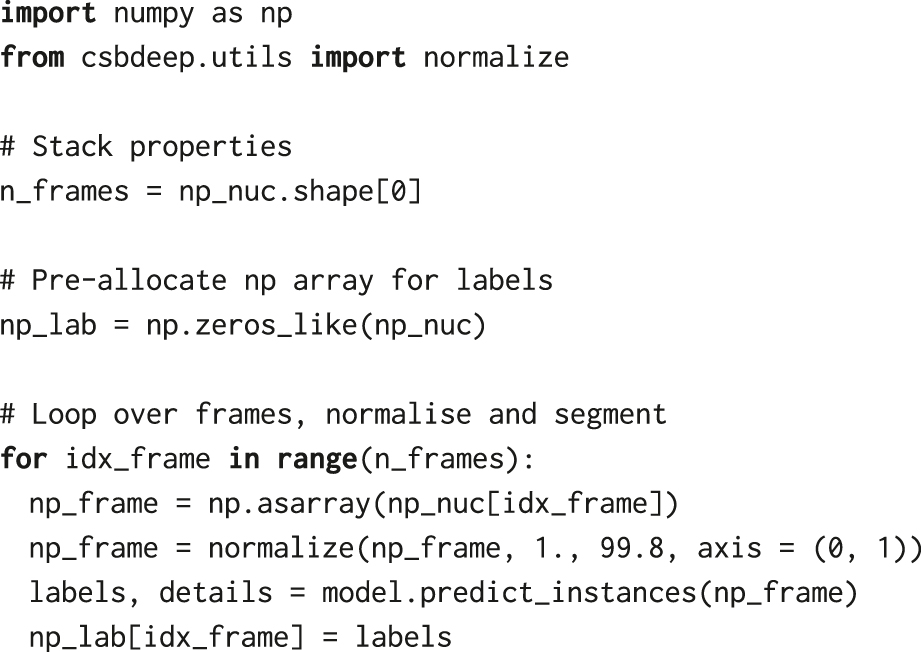 We then pre-allocate a NumPy array of the same size as the image stack, which we will use to store segmentation labels. The input images need to be normalised to the same range as the data used to train the StarDist model, i.e., [0,1]. Therefore, we normalise fluorescence intensities in every frame using normalize from the csbdeep.utils package. Finally, we loop over frames of the H2B channel stack and predict the location of nuclei using StarDist’s model.predict_instances. If no parameters are provided, the prediction step uses a default threshold for the probability, 0.479071, which can be overridden with the prob_thresh parameter.