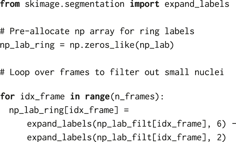 To quantify ERK activity from the ERK-KTR translocation biosensor, we calculate the ratio between the mean cytosolic and nuclear fluorescence intensities, which requires creating an image mask for the cytosol. For every time frame, we perform a series of operations on the existing nuclear mask that create a 4-pixel-wide ring around the nucleus. In the absence of a cytosolic or membrane marker, the ring acts as a proxy for the cytosol. First, we expand the nuclear labels by 6 pixels using expand_labels from skimage.segmentation. Then, we subtract a smaller mask, also obtained from the nuclear mask but only by expanding it by 2 pixels. Rings are 4 pixels wide, with a gap of 2 pixels between the nuclei and rings (Figure 3B).