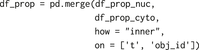 Similar steps, but only with properties = [‘intensity_mean’, ‘label’], yield another pandas data frame, df_prop_cyto, with properties for the cytosolic ring. To obtain a single data frame containing, in a single row, nuclear and cytosolic properties of a cell at a time point, we merge the two tables based on two common key columns: object label ‘obj_id’ and frame number ‘t’ (both integers). To facilitate the merge, we rename the columns in df_prop_nuc and df_prop_cyto generated by regionprops_table, i.e.: