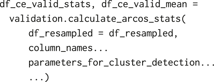 where eps is the search radius in pixels for spatial clustering in individual frames with DBSCAN; minClsz is the minimum number of cells that comprise spatial clusters identified by DBSCAN; nPrev is the number of previous time frames which are used to link spatial clusters in the current time point. The choice of the search radius depends on cell density and the size of clusters of active cells. If set too large, nearby independent CEs are included in a single cluster; too small, and a single CE is identified as several smaller events. A utility function estimate_eps from the arcos4py.tools module helps to estimate eps based on nearest neighbour distances: