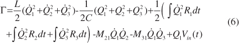 where, Ii(t)=dQi(t)/dt, where i=1, 2, 3 is the current flowing in the circuit i. Substituting Eq. (6) to the Euler-Lagrangian equations