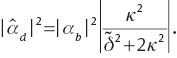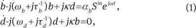 where b and d are the field amplitudes in the bright and dark resonators, respectively, αb is coupling strength of the bright resonator to the wave in the waveguide, Sin and ω are amplitude and frequency of the incident light wave, respectively, and κ is a real number determining coupling strength between the resonators [53]. In Eq.(1) the amplitudes b, d and Sin are normalized such that |b|2 and |d|2 is the energy stored by the resonators and |Sin|2 is the incident power.