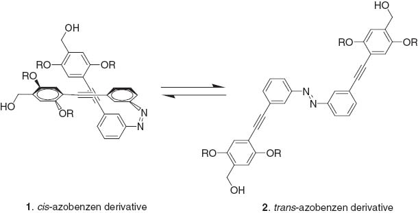 Ajayaghosh et al. have also demonstrated photo-induced reversible dot to rod variation of assembled structures of azobenzene derivatives 1, 2 [27]. Irradiation of nanodots with UV light induced partial conversion of trans-azobenzene 2 to its cis-isomer 1. Even though the conversion yield is not very large a locally high concentration of the cis-isomer 1 on the surface of the dots enhanced the surface dipole moment making the nanodot structures unstable due to an increase in ζ-potential. This situation facilitates interparticle association, resulting in formation of rod-shaped structures. They also synthesized azobenzene-linked phenyleneethynylenes that could form helical supramolecular assemblies [28]. Helicity of the assemblies formed were of a specific chirality that could be reversibly switched to the opposite helical sense through a chiral-center-controlled photoisomerization of the attached azobenzene moieties.