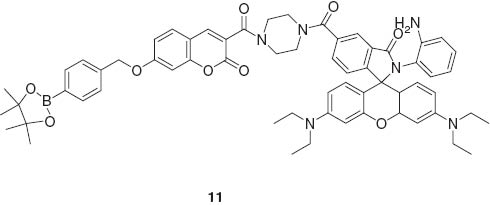 This system realized concurrent detection of both the important ion species in living cells. Lin et al. developed a fluorescent probe 11 responding to H2O2, NO, and H2O2/NO with three different sets of photonic signals. Intracellular imaging of these species was also demonstrated [61].