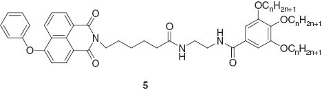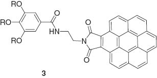 George and coworkers used an unsymmetrical coronene monoimide 3 for formation of hydrogen-bonding-mediated supramolecular gels. Gels are formed through the concept of repulsion between dipoles to maintain a head-head staggered organization [29]. Hydrogen-bonding enforcement minimizes dipolar repulsion between chromophores.
