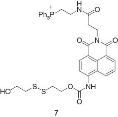The design of fluorescent probes for organic molecules with complex structures has been an active research area where improvements of specificities in the recognition process are anticipated. Yang, Chan, and coworkers reported fluorescent probe molecules with a bis-spiropyran ligand for detection of glutathione (Figure 3) [56]. Multi-point molecular recognition leads to high affinity and specificity for glutathione and this system was used to realize in vivo detection of glutathione in living cells. Detection systems for small organic molecules accompanied by selective chemical reactions in cells have also been developed. For example, Kang, Kim, and coworkers reported an off-on fluorescent probe for mitochondrial thioredoxin [57]. The synthetic probe molecules Mito-Naph 7 react with thioredoxin to induce release of thiolate via intramolecular cyclization, resulting in fluorescent compounds.