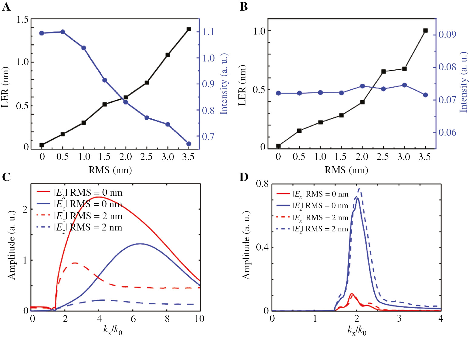 The LER, field intensity and field components for both systems with different surface roughness are compared in Figure 4A and B. The intensity is defined as the average peak intensity and the LER is calculated as the average RMS deviation at the positions along the sidewall of the patterns (definitions and calculations are given in Supplementary S7). For the superlens system, as the RMS roughness of the Ag film increases from 0 to 3.5 nm with 0.5 nm increments, the LER of the pattern in the PR film increases from about 0 to 1.4 nm, which is denoted by the black squares. Meanwhile, the peak intensity decreases drastically from ~1.1 to ~0.67 V2/m2 (denoted by the blue dots). For the HMM system, the corresponding LER increases from about 0 to 1.0 nm, which is lower than that in the superlens system. Because the loss of Al is higher than that of Ag at 365 nm wavelength, the intensity of the pattern transmitted through the HMM diminishes by more than one order of magnitude compared to that through a single Ag film. However, the intensity is stable as the surface roughness increases, which is different from the decreasing trend in the superlens system.