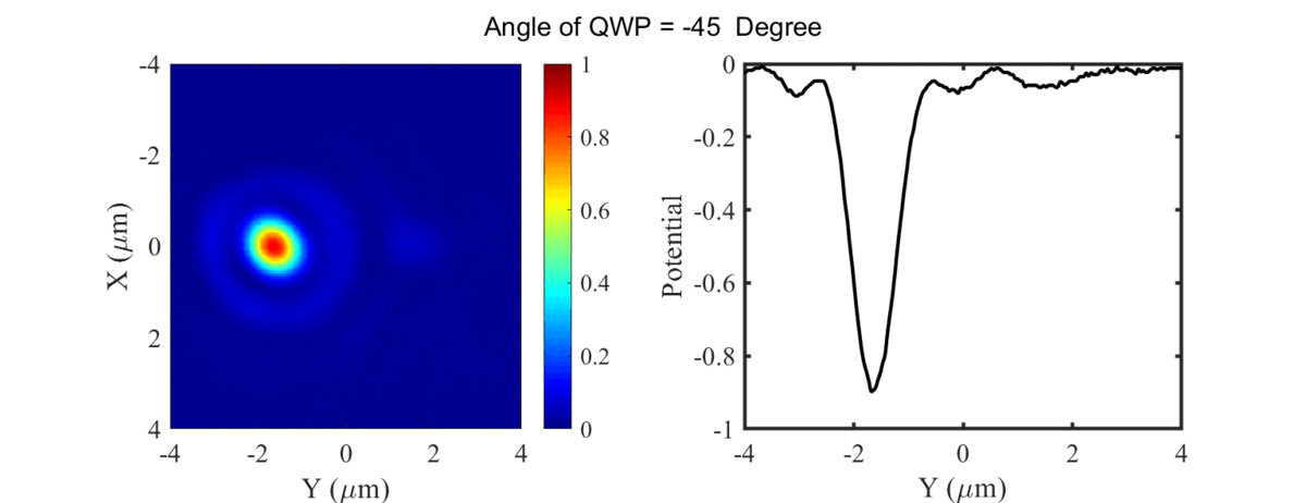Figures 3 and 4 show the optical intensity and relatively optical potential distributions of two samples (Figure 3(b): D = 0.92 μm, and Figure 4(b): D = 3.2 μm) when the incident laser beam is linearly polarized. Note that as the incident laser beam is not perfectly LP, the relative intensity of the two focal points is not precisely identical. As shown in Figures 3(b) and 4(b), the real distance of the two samples is measured to be 0.92 μm and 3.2 μm, which are almost equal to the designed values 0.9 μm and 3.15 μm. Comparing Figures 3(d) and 4(d), the central depth of the 0.92 μm sample is shallow, while that of the 3.2 μm sample is high enough for isolating the potential into two wells and trapping 2 particles for simultaneously levitating two particles at each focal point.