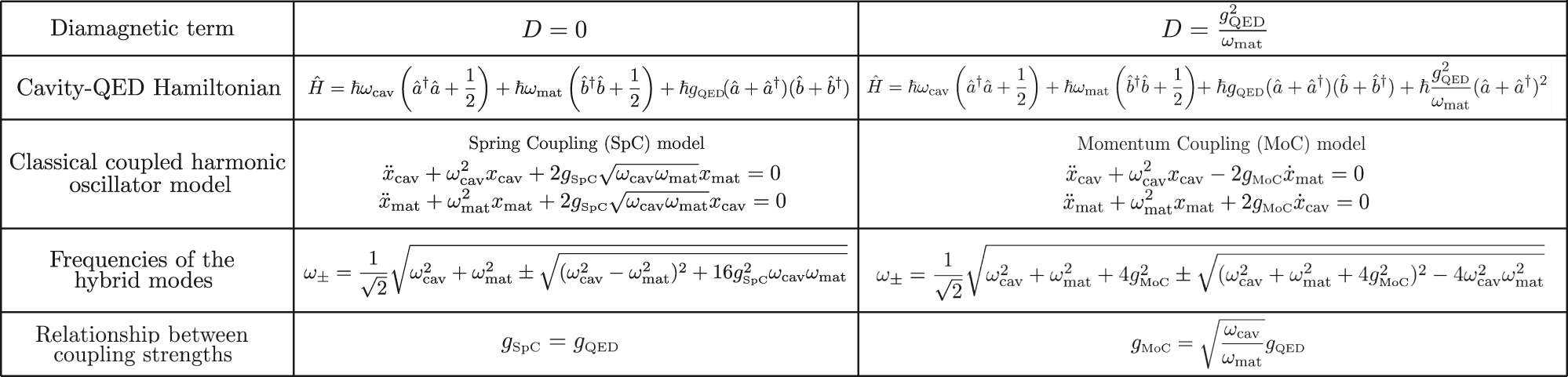 The connection between classical and quantum models is summarized in Table 1. The classical SpC and MoC models result in the same eigenfrequencies as cavity-QED Hamiltonians without the diamagnetic term (D = 0) and with