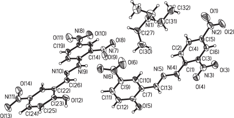 - Crystal structure of (E)-2-((2-(2,4-dinitrophenyl)hydrazono)methyl)-4-nitrophenol — triethylamine (2/1), C32H33N11O14