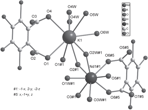 As a versatile benzendicarboxylate ligand, the tetrachlorophthalate ligand was rarely used to construct complex. By now, there are few of published reports concerning metal complexes with 3,4,5,6-tetrachlorophthalate (tcph), which may play the role of bridging ligand in transition metal complexes [1–6] and terminal ligand in rare earth metal complexes [7–11]. All the reported rare earth metal complexes have a mononuclear structure and contain the Htcph− or tcph2− ligand in terminal coordinate style. Whereas, this article presents a novel mixed neodymium and potassium complex with a two-dimentional network structure, showing the tcph2− ligand in the polydentate bridging mode.