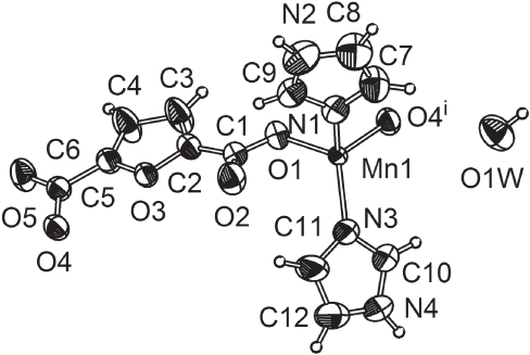 The asymmetric unit of the title structure consists of one Mn(II) cation, one furan-2,5-dicarboxylate anion, two imidazoles and one water molecule (see the Figure). Each manganese is tetrahedrally coordinated by two carboxylate oxygens (dMn1–O of 1.997(14) Å and 1.997(3) Å) from different furan-2,5-dicarboxylate, and two imidazoles (dMn1–N of 1.984(3) Å and 1.992(3) Å).
