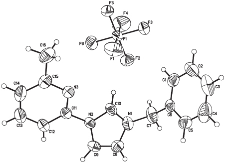 - Crystal structure of 1-benzyl-3-(4-methylpyridin-2-yl)-1H-imidazol-3-ium hexafluorophosphate, C16H16F6N3P