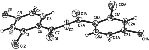 The title compound was prepared according to the literature procedure [1]. 2,4-Dichlorobenzoic acid (0.04 mol) was added in the mixture containing N,N′-dicyclohexylcarbodiimide (0.02 mol) and cold acetone (45 mL). The system was stirred in ice bath for 1 h and TLC monitored, then kept overnight in a refrigerator at 4°. A white precipitate of dicyclohexylurea was filtered off and the solvent was evaporated under vacuum to give the crude anhydride product as oil. A crystalline product could be obtained from hot ethanol or methanol, in 65% yield, mp = 110–111°. Crystals suitable for the X-ray diffraction study were obtained upon free evaporation of the reaction mixture from pure ethyl acetate.