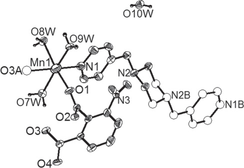 A mixture of Mn(OAc)2·4H2O (0.025 g, 0.10 mmol), 3-nitro-1,2-benzenedicarboxylic acid (0.2 mmol, 42.2 mg), 1,4-bis(4-pyridylmethyl)piperazine (0.027 g, 0.10 mmol), EtOH (4 mL) and H2O (3 mL) was placed in a 23 mL Teflon-lined autoclave at 393 K for 4 days, then cooled to room temperature and obtained colourless block crystals in ca. 79% yield. Elemental analysis calcd. (%) for C16H21N3O10Mn: C, 40.92; H, 4.61; N, 8.92. Found: C, 40.86; H, 4.50; N, 8.93. Selected IR (KBr, cm−1): 2800–3600(m), 1639(w), 1597(m), 1563(s), 1523(m), 1452(w), 1433(m), 1340(m), 1304(m), 1232(w), 1158(w), 1145(w), 1068(s), 1000(m), 920(m), 847(m), 825(s), 802(w), 779(w), 755(w), 713(m), 695(s), 665(w).