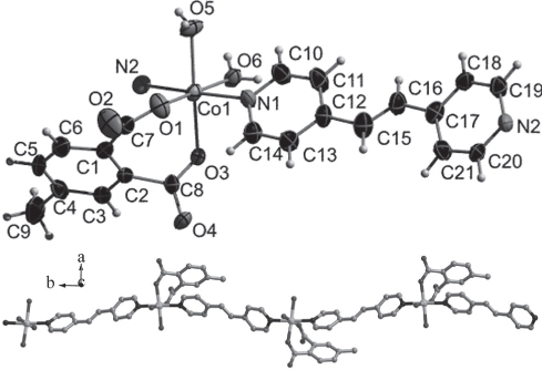 Co(II)-based coordination polymers (Co-CPs) with multicarboxylate ligands are of contemporary interest because of their structural topologies and potential applications in the areas of catalysis, gas adsorption/separation and magnetism [1–4]. Phthalic acid (benzene-1,2-dicarboxylic acid) and its derivatives have been widely utilized to construct coordination polymers [5–8]. In the other hand, rod-like N,N′-donor ligands, such as 1,2-bis(4-pyridyl)ethene (bpe), are widely employed to construct coordination polymers [9, 10]. Herein, we report a new three-dimensional Co(II) supramolecular coordination polymeric network constructed by 4-methylphthalate (mph) and bpe. There is one Co(II) ion, one mph2−, one bpe and two coordinated water molecules as well as three free water molecules in the asymmetric unit. The Co1 is six-coordinated with a distorted octahedral geometry by two trans N atoms from two bpe, two water molecules and two carboxylato-O atoms from two different carboxylate groups of the same mph2− (Figure top). The Co(II) ions are joined by bpe to form a 1-D chain (Figure lower part). The 1-D chains are further linked by hydrogen bonding O(6)—H(4W)⋯O(4)′ and O(5)—H(2W)⋯O(3)′ (Symmetry code: ′ = −x + 1/2, y, z+1/2, d(O⋯O) = 2.702(6) and 2.791(5) Å) to form a 3-D supramolecular architecture.
