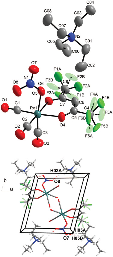 The title compound, fac-[NEt4][Re(CO)3(Hfaa)(NO3)], consists of three facial coordinated carbonyl ligands, a fluorinated β-diketone ligand (hexafluoroacetylacetonate-Hfaa) in the axial position, a nitrate ligand in the equatorial plane, as well as a counterion, tetraethylammonium (NEt4), in the asymetric unit (see the figure, upper part). The coordination at Re(I) is a distorted octahedron, as seen in the C3—Re1—O6 (170.30(19)°) angle which deviates from 180°. The O4—Re1—O5 bite angle of 84.14(15)° correlates well with a similar hexafluoroacetylacetonate coordinated Re(I) complex, 84.56(8)° [6]. The bond distances in the coordination polyhedron, are within normal range when compared to a similar structure, ranging from 1.892(6) to 2.157(4) Å [16]. The molecules within the unit cell are packed in horizontal layers, in a head-to-head manner, when viewed along the c-axis. These layers are stabilised by intermolecular C—H⋯O bonds (see the figure, lower part).