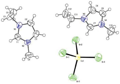 All the reagents and solvents were commercially available and used as purchased. A mixture of CdCl2·2.5 H2O (0.129 g, 0.56 mmol) and excessive amount of 1-ethyl-3-methylimidazolium bromide (0.5 g, 2.6 mmol) was placed in a Teflon-lined stainless vessel and heated to 433 K for 72 h. After cooling to room temperature, the colorless crystals were obtained (yield, 76% based on cadmium). Elemental analysis-found: C, 21.99%; H, 3.38%; N, 8.57%; calc. for C12H22Br4 N4Cd: C, 22.02%; H, 3.39%; N, 8.56%.