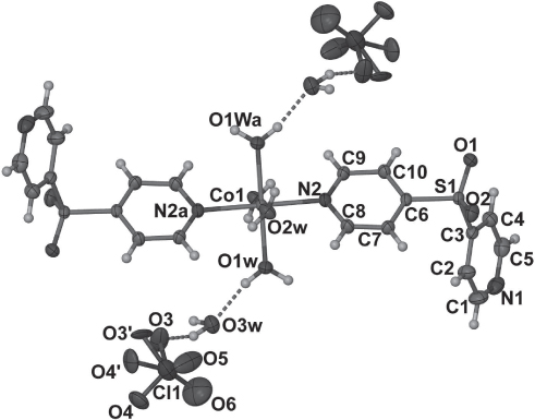 Transition metal complexes of di-4-pyridylsulfide and its positional isomers have been already studied [2–4]. Only several metal complexes with 4-(pyridin-4-ylsulfinyl)pyridine, and one derivate of di-4-pyridylsulfide, were reported recentely [5]. Herein, we report a mononuclear Co(II) complex with a newly synthesized 4-(pyridin-4-ylsulfonyl)pyridine. In the title complex the Co(II) ion is located on an inversion center with a slightly ditorted N2O4 octahedral coordination sphere comprising N atoms from two monodentate trans-related 4-(pyridin-4-ylsulfonyl)pyridine ligands and four aqua ligands. The two perchlorate anions are linked to the O1w of the mononuclear complex molecule through O—H⋯O hydrogen bonds (O3w⋯O3 2.835(2) Å, O3w⋯O1w 2.753(3) Å) (see the figure). The Co1—N2 bond length is 2.172(2) Å. The C—S—C angle equals 105.78(12)°, which is comparable to that value of 104.05(8)° in 4-(pyrazine-4-ylsulfonyl)pyrazine [6].
