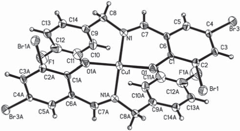 - Crystal structure of bis(2,4-dibromo-6-{(E)[(4-fluorobenzyl)imino]methyl}phenolato-κ2N,O) copper(II), C28H18Br4F2N2O2Cu
