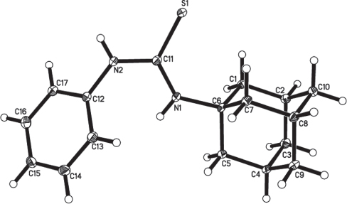 The adamantane nucleus represent an important structural motif in several biologically and pharmaceutically active drugs [1, 2]. Several adamantane-based drugs are currently used as efficient medications against influenza viral infections [3–5], malaria infections [6], central nervous disorders [7, 8], hyperglycaemia [9] and drug-resistant TB strain infections [10]. In addition, thiourea derivatives are recognized as potent anti-Malaria [11], anti-HIV [12], anticancer [13] and antimicrobial [14] agents. As a part of an ongoing research interest in the chemotherapeutic [15–17] and structure [18–20] of adamantane derivatives, we report herein, the crystal structural of the title compound. In the title structure the asymmetric unit of the crystal structure contains one molecule. The title molecule is a functionalized thiourea with an adamantyl and phenyl substituents attached to the two nitrogen atoms, N1 and N2. The molecules packing in the crystal structure is stabilized via one intermolecular hydrogen bond, of which S1 acts as the hydrogen bond acceptor and the NH group of N2 acts as hydrogen bond donor. The distance of the interactions between N2—H1N2⋯S1i is 2.554 (17) Å and the angle is 158.6(15) Symmetry code: (i) -x, -y+2, -z+1.
