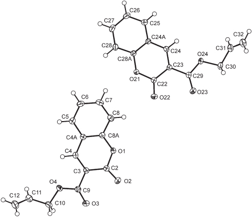 The individual molecules associate by means of soft C—H⋯O interactions, namely via hydrogen bonds C6–H6⋯O2i with C6⋯O2i = 3.2436(15) Å, and C26–H26⋯O22ii with C26⋯O22i = 3.2435(14) Å (i = 1 + x, y, z). Also detected can be an pair of C28–H28⋯O2i and C27–H27⋯O1i interactions (C28⋯O2i = 3.4816(15) Å and C27⋯O2i = 3.4512(15) Å). Albeit relatively long (i.e., weak), these interactions operate in supportive manner (pairs) and their stabilization influence is therefore combined. It is noteworthy that an inspection of the supramolecular structures of coumarin-3-carboxylate esters mentioned above and similar compounds (e.g.; 4-halophenyl 2-oxo-2H-chromene-3-carboxylates, where 4-halophenyl is 4-chlorophenyl [8], 4-bromophenyl [9]; menthyl 2-oxo-2H-chromene-3-carboxylate [10], and 4-(octyloxy)phenyl 2-oxo-2H-chromene-3-carboxylate [11]) revealed a whole palette of weak C–H⋯O hydrogen bond interaction that preferrentially involve the exocyclic carbonyl moiety. An interaction similar to the pairing via hydrogen bonds toward the coumarine oxygens could be so far detected only in the structure of the 4-(octyloxy)phenyl ester [11].