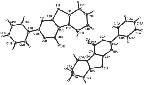 The asymmetric unit of the crystal structure contains two independent molecules with little difference in bond lengths and angles. In molecule A, the dihedral angle between the phenyl ring (C12—C16) and the thieno[2,3-d][1,3]oxazin-4-one moiety (S1/C1-C10/O2/N1) is 4.54(2)°, whereas this value in molecule B slightly is larger (12.44°). The molecules in the crystal structure at least interact via two non-classical intermolecular hydrogen bonds, of which O1B and S1B work as hydrogen bond acceptors and C14A and C12A work as hydrogen bond donors. The distance of the interactions between C14A—H14A⋯O1Bii and C12A—H12A⋯S1Bi are 2.59 and 2.84 Å, respectively and the angles are 153 and 175°, respectively. Symmetry codes: (i) −x+1, −y, −z+1; (ii) x, y, z+1.