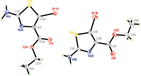 The asymmetric unit of the title structure, contains two independent molecules, which show great similarity in bond lengths and angles. The 2-aminothiazole ring and the ethyl carboxylate group are almost planar. All geometric parameters are in excellent agreement with those found for the 4-phenyl analogues [6, 7]. The similarity of these two structures extends to their hydrogen-bonding motifs. The molecules in the title structure are connected via three intermolecular hydrogen bonds, N1A—H1AA⋯N2Ai, N1B—H1BA⋯O1Bii and N1B—H1BA⋯N2Bii. The H⋯A distances are 2.12, 2.57 and 2.16 Å, respectively and the angles are 165, 122 and 163°, respectively. Symmetry codes: (i) −x+1, −y−1, −z+1; (ii) −x+2, −y+1, −z+1.