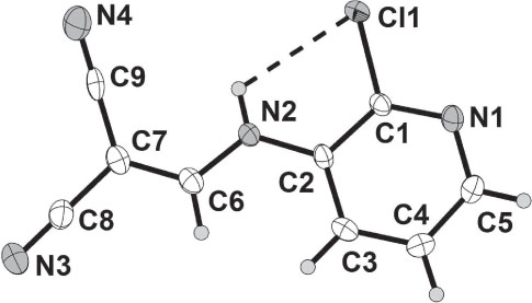 Pyridine derivatives were shown antibacterial [1], antimalarial [2], anticonvulsant [3], and cytotoxic agents [4–6]. These findings led us to continue our work on the synthesis of biologically active compounds [7–10]. The aim of this work was to, synthesize the corresponding compound having a biologically active methylenemalononitrile moiety. The crystal structure of target compound contains one molecule in the asymmetric unit. There is one intramolecular N—H⋯Cl hydrogen bond (figure). The crystal structure is stabilized by three intermolecular hydrogen bonds, of which N1, N3 and N4 work as hydrogen bond acceptors and N2, C6 and C4 work as hydrogen bond donors. The distance of the interactions between N2—H1N2⋯N1i is 2.51(3) Å, C4—H4A⋯N4ii is 2.58 Å and C6—H6A⋯N3iii is 2.4 Å and the angles are 138(3)°, 145° and 151°, respectively. Symmetry codes: (i) −x+1, y−1/2, −z+1/2; (ii) x+1, −y+3/2, z+1/2; (iii) −x, −y+1, −z+1.