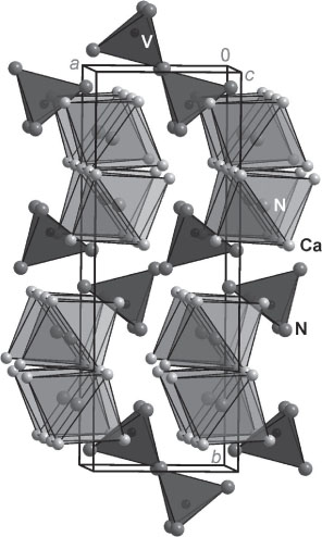 Although isolated [VN4]7− units were found in different crystal modifications of Li7VN4 [1], only crystal structures with one-dimensional anions represented by infinite chains of corner sharing 1∞(VN2/2N24−) tetrahedra have been reported so far for nitridovanadates(V) of alkaline earth metals [2, 3]. Inspection of the PXRD pattern and further Rietveld refinement revealed that the title phase is isotypic with another group V element ternary nitride, Sr5NbN5 [4], and belongs to the Na5OAsO4 structure type [5]. The structure can be described as consisting of isolated [VN4]7− tetrahedra and zigzag chains of corner-sharing 1∞(NCa4Ca2/27+) octahedra running along the c direction as shown in the figure. A distortion of the tetrahedra lowers the local symmetry down to Cs. Refined V—N distances lie in the range 1.85(2) Å – 1.91(3) Å, which is close to the values observed for other nitrides bearing tetrahedrally coordinated V(V) [1–3]. Band-structure calculations revealed an insulating ground state in accordance with the crystal structure.