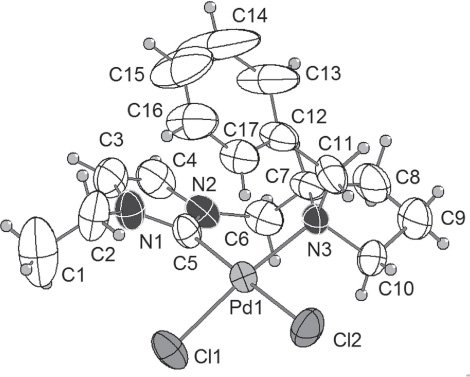 C17H23Cl2N3Pd, orthorhombic, P212121 (no. 19), a = 9.6460(18) Å, b = 13.883(3) Å, c = 14.520(3) Å, V = 1944.4(6) Å3, Z = 4, Rgt(F) = 0.0373, wRref(F2) = 0.0917, T = 298(2) K.