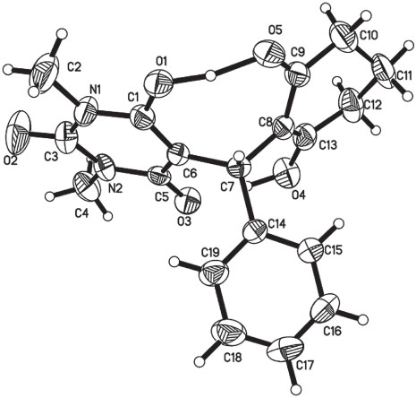 - Crystal structure of 6-hydroxy-5-((2-hydroxy-6-oxocyclohex-1-en-1-yl)(phenyl)methyl)-1,3-dimethylpyrimidine-2,4(1H,3H)-dione, C19H20N2O5