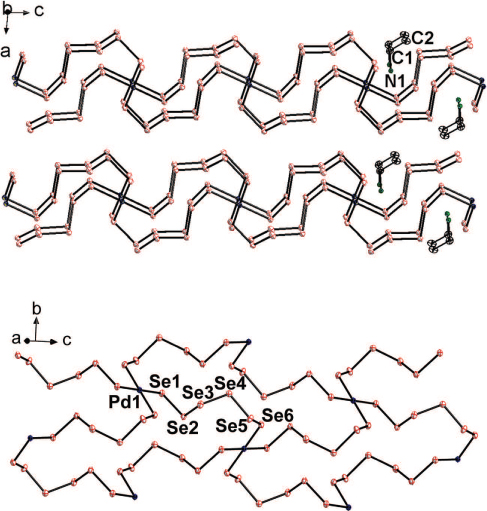 For the structure of the polymeric [Pd(Se6)2]2− in (EtNH3)2[Pd(Se6)2], the square planar geometry around Pd(II), coordinated by four bridging hexaselenide ligands, is quite ideal as Se—Pd—Se angles are in the range of 89.51(2)–90.49(2)°. The Pd—Se and Se—Se distances are also typical, ranging from 2.421(1) to 2.439(1) Å, and from 2.330(1) to 2.362(1) Å, respectively, similar to those found in the other [Pd(Sex)2]2− complexes [1–5]. In the layers of [Pd(Se6)2]2−, hexaselenide ligand chains are connecting Pd metal centers in a helical screw mode, resulting in 28-membered rings composed of four Pd and twenty four Se atoms (lower part of the figure). The distances between two couples of Pd centers faced diagonally in the 28-membered ring are 7.6646(2) and 16.7440(5) Å, respectively. These distances are 10.807(4) and 15.050(5) Å for (CH3)N(CH2CH2)3N2[Pd(Se6)2]. Obviously, the smaller cation, EtNH3+ forces to shrink the 28-membered ring into a much narrower shape, compared to the ring with the larger cation, (CH3)N(CH2CH2)3N+. Flexible and versatile Se6 ligands appeared to be responsible for the stability of the 28-membered ring in two different shapes. As we can see from the side view of the layers, EtNH3+ cations are placed in between [Pd(Se6)2]2− layers to fit snuggly in the pockets (upper part of the figure). Se⋯H-N hydrogen bonds are present with Se⋯H distances as short as 2.6 Å.