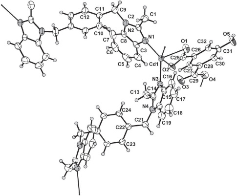 C64H54Cd2N8O11, monoclinic, P21/c (No. 14), a = 10.314(2) Å, b = 18.290(4) Å, c = 16.516(6) Å, β = 113.91(2)°, V = 2848.3(13) Å3, Z = 2, Rgt(F) = 0.0440, wRref(F2) = 0.0890, T = 293(2)K.