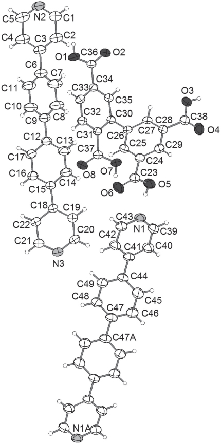 108. Crystal structure of biphenyl-2,3′,5,5′-tetracarboxylic acid – 4,4′-biphenyl-4,4′-diyldipyridine (3/2), C49H34N3O8