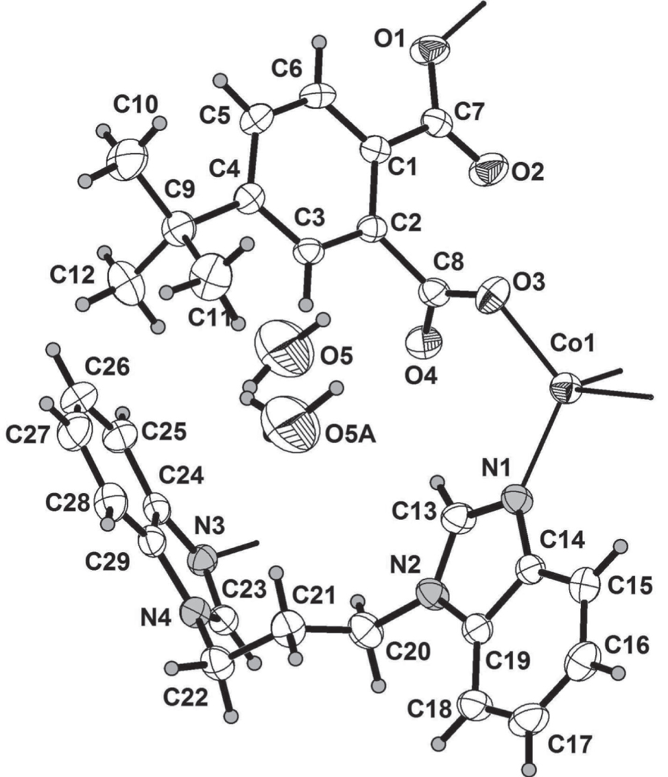 5. Crystal structure of poly-[(μ2-((1,3-bis(benzimidazol-1-yl)propane-κ2N:N′)(μ2-4-tert-butyl-phthalato-κ2O:O′)cobalt(II)] monohydrate, C29H30CoN4O5