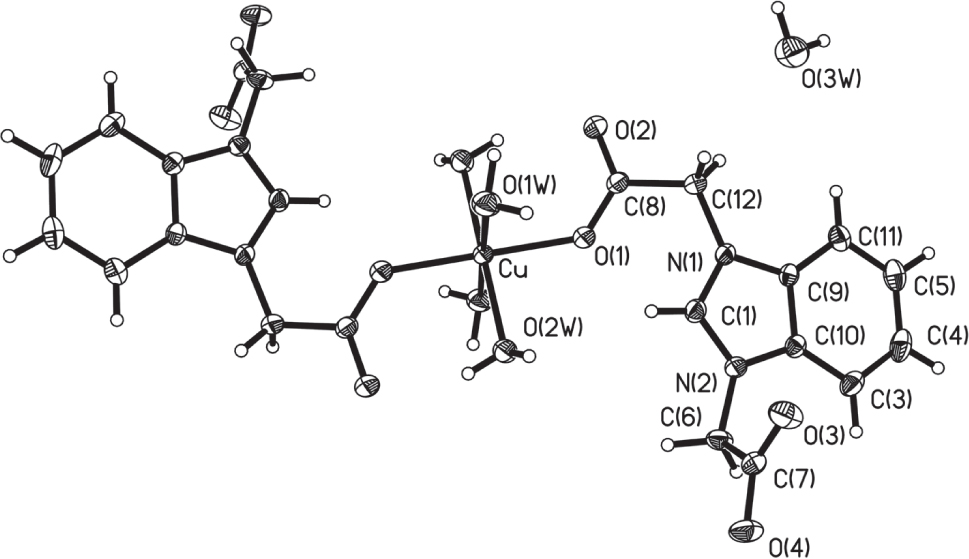 The asymmetric unit of the title structure consists of one half of a monomer complex (cf. the figure, the asymmetric unit is labeled) and one uncoordinated water molecule with the occupation of 25%. The Cu(II) atom lies on the inversion center and is six-coordinated by four O atoms from four coordinated water molecules and two O atoms from two monodentate coordinating ligands. The Cu(II) atom adopts a slightly distorted octahedral geometry. The axial Cu—O bond distances are in the range of 1.986(2) Å and 2.298(2) Å. The benzimidazolium moiety (C1/N1/C9/C11/C5/C4/C3/C10/N2) is essentially planar, with a mean deviation of 0.0124 Å. The carboxylate groups adopt trans conformations, with the C10—N2—C6—C7 and C9—N1—C12—C8 torsion angles to be 84.26° and 138.48°, respectively. In the crystal structure, the coordinated water molecules are hydrogen-bonded to carboxylate O atoms to generate a two-dimensional network parallel to the ab plane (O2W—H2WB⋯O2′ 2.703(3) Å; O2W—H2WA⋯O3′′, 2.663(3) Å; O1W—H1WA⋯O4, 2.794(3) Å; O1W—H1WB⋯O4′′′, 2.740(3) Å; ′ = 2 − x, −y, 2 − z; ′′ = 1 − x, 1 − y, 2 − z; ′′′ = x, −1 + y, z). The two-dimensional network are further extended into a three-dimensional supramolecular structure along the crystallographic c direction via π–π stacking interactions between benzimidazolium rings from adjacent layers, with a centroid-centroid distance of 3.588 Å.
