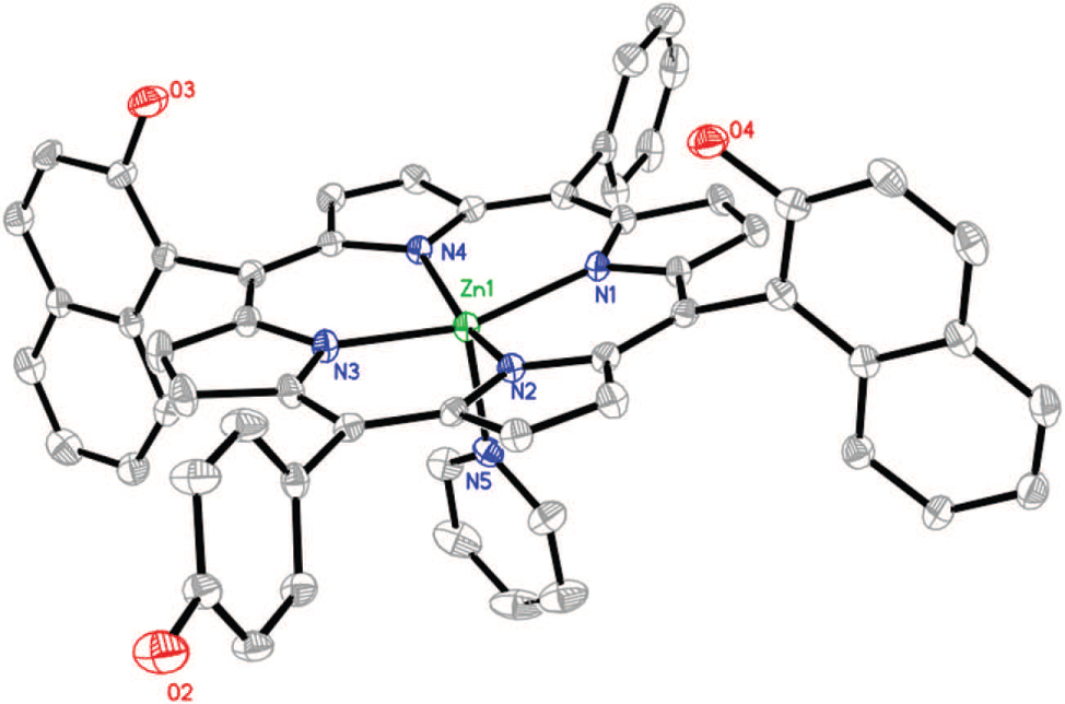 - Crystal structure of (5,15-cis-bis(2-hydroxy-1-naphthyl)-10-phenyl-20-(4-hydroxyphenyl)-porphyrinato)-(pyridine)-zinc(ii) pyridine solvate, C67H47N7O3Zn