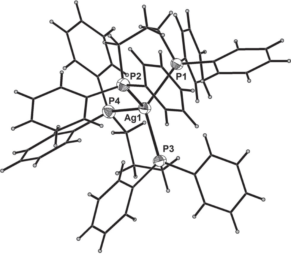 - Crystal structure of bis(1,3-bis(diphenylphosphino)propane-κ2P,P′)silver(I) trifluorosulfonate–methanol (1:0.5), [Ag(C27H26P2)]SO3CF3⋅0.5CH3OH