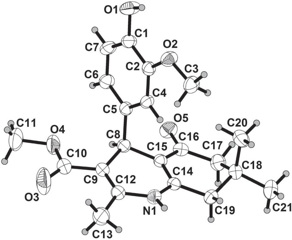 24. Crystal structure of 4-(4-hydroxy-3-methoxy-phenyl)-2,7,7-trimethyl-5-oxo-1,4,5,6,7,8-hexahydro-quinoline-3-carboxylic acid methyl ester, C21H25NO5