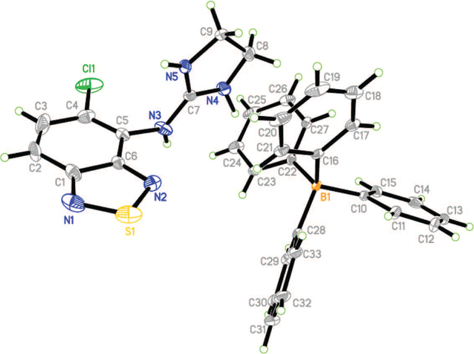 - Synthesis and crystal structure of 2-((5-chlorobenzo[c][1,2,5]thiadiazol-4-yl)amino)-4,5-dihydro-1H-imidazol-3-ium tetraphenylborate, C33H29BClN5S