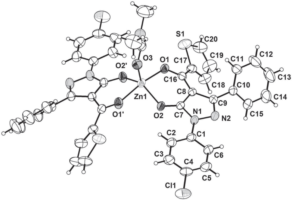 - Crystal structure of bis-(1-(4-chlorophenyl)-3-phenyl-4-thenoyl-1H-pyrazol-5-ol-κ2O,O′)-(N,N-dimethylformamide)zinc(II), C43H31Cl2N5O5S2Zn