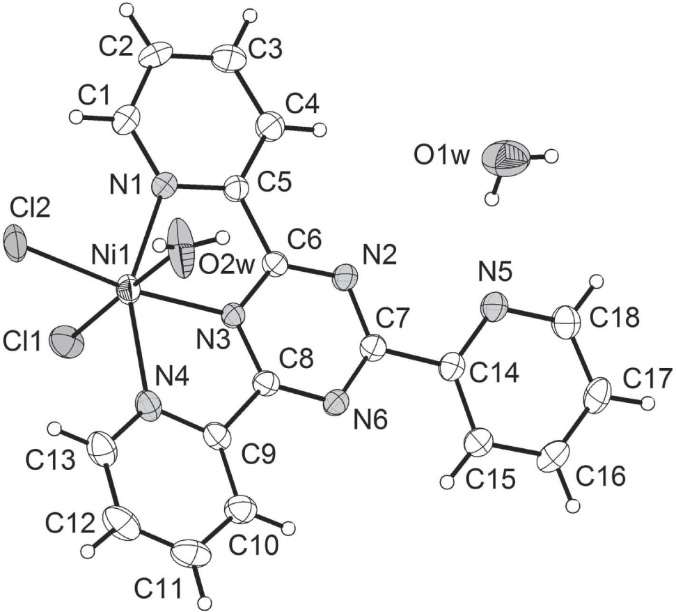 The compound is monomeric, with an Ni centre octahedrally coordinated by three N atoms of the TPTZ ligand, one water molecule and two chlorido ligands. Two nitrogen atoms (N1 and N4) of pyridyl rings, one nitrogen atom (N3) of the triazine ring from the TPTZ ligand and one Cl atom (Cl2) form the equatorial base, while the O atom (O2w) of a water molecule and the other Cl atom (Cl1) occupy the axial positions. The bond distances and angles around the NiII ion significantly deviate from 180°: O2w—Ni1—Cl1 (177.61(9)°), N3—Ni1—Cl2 (170.84(7)°), N4—Ni1—N1 (152.22(8)°). As expected, the N–Ni–N chelating angles are with values of N1—Ni1—N3 (76.19(8)°) and N3—Ni1—N4 (76.10(8)°) more acute than the Cl1—Ni1—Cl2 bond angle (96.27(3)°). The Ni—Cl bond lengths are approximately equal (2.4035(8) Å and 2.3473(8) Å). The Ni—Npy bonds (2.158(2) and 2.170(2) Å) are longer than the Ni—Ntriz bond (1.996(2) Å). These results are similar to the related manganese complex [9]. The TPTZ ligands slightly deviate from planarity: the three pyridyl rings are twisted with respect to the central triazine ring by angles of 2.99(17)°, 2.54(17)° and 13.25(15)° with the N5 ring (uncoordinated pyridine ring) displaying the highest degree of twisting. The uncoordinated pyridine ring was reported as 11.8° twisting angle in the manganese analogue [9]. The TPTZ ligand, with the exception of the non-coordinating pyridyl moiety is close to planar with an rms deviation of 0.0468 Å from the best fit plane through all ligand atoms. The ligand plane also lies close to the equatorial plane of the complex defined by the Cl2, N1, N3 and N4 donor atoms with 4.60(7)° and close to the axial plane of the complex defined by the Cl1, Cl2, O2w and N3 donor atoms with 86.52(6)°.